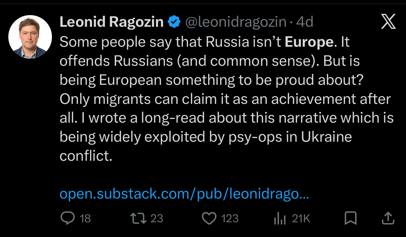 This is categorically not the case. Russia is distinct from Europe, culturally, civilisationally, linguistically, socially, and geographically. We wager that people who claim otherwise are formulating a skewed homology and lack a sophisticated understanding of categorical relationships, or are being deliberately manipulative.